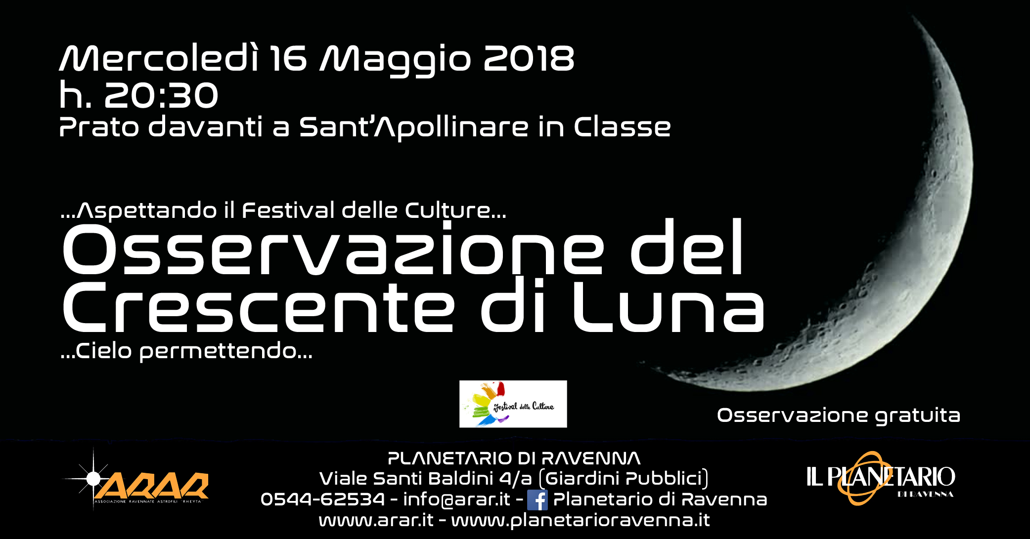 L’avvistamento del primo spicchio di Luna sancisce, per il mondo Islamico, l’inizio del mese e quello del 16 maggio, in particolare, indica l’inizio del mese del digiuno, il Ramadan. In accordo con alcune Associazioni culturali, abbiamo piazzato i telescopi nei giardini antistanti la Basilica di Sant’Apollinare in Classe; purtroppo i nostri sforzi non sono stati premiati data la presenza di grosse nuvole proprio davanti alla Luna. Replicheremo il 14 giugno per la fine del Ramadan, sperando in un meteo più clemente...