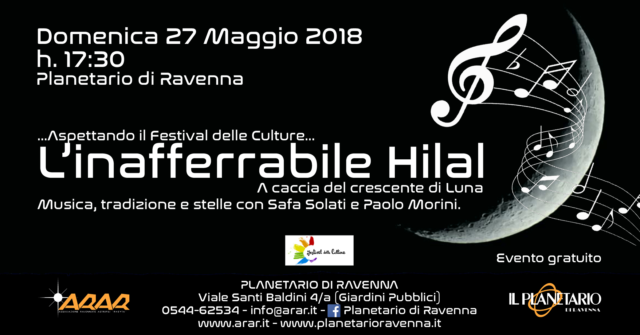 Per il pre-Festival delle Culture, un’emozionante esibizione musicale di Safa Solati ha accompagnato la conferenza di Paolo Morini sul crescente di Luna, l’inafferrabile Hilal. Nonostante il caldo la sala era affollata e il pubblico ha gradito molto questa presentazione.
