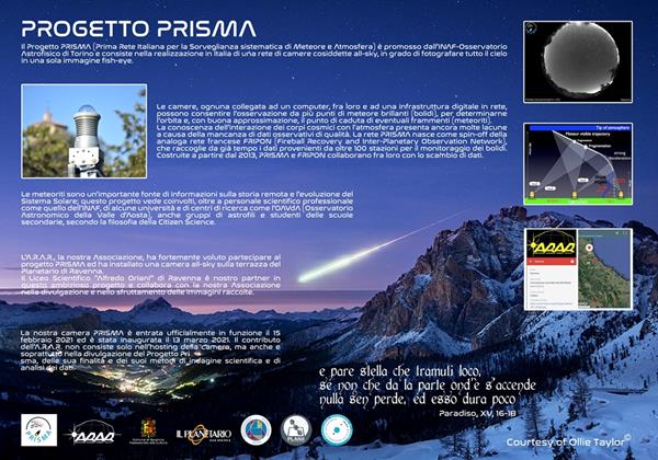 Sabato 13 marzo l’abbiamo inaugurata, virtualmente, con una conferenza stampa on line alla presenza delle autorità; per l’Assessorato alla Cultura c’era il Dott. Maurizio Tarantino e per l’Assessorato all’Istruzione l’Assessora Ouidad Bakkali. Oltre alle autorità erano presenti personaggi del mondo scientifico e scolastico; in particolare il Dott. Daniele Gardiol, Primo Tecnologo presso l’Istituto Nazionale di Astrofisica (INAF) e coordinatore nazionale del Progetto Prisma, il Dott. Paolo Volpini della Commissione Divulgazione UAI (Unione Astrofili Italiani) e il Prof. Gianluca Dradi (Dirigente Scolastico del Liceo Scientifico “Alfredo Oriani” di Ravenna che è la scuola che abbiamo indicato come riferimento per questo progetto).