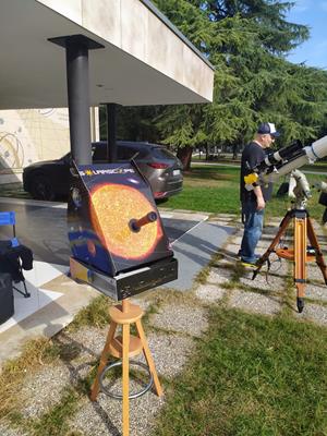 Fra gli strumenti schierati per l’eclissi di Sole, il Solarscope versione educational, una novità nel nostro parco-macchine e che ha dato ottima prova. Ma se per qualcuno l’eclissi poteva essere un felice imprevisto, per altri faceva parte di un preciso progetto didattico inserito in un percorso PCTO, come per i ragazzi del Liceo Scientifico di Ravenna.
