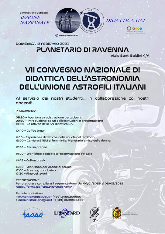 Dopo la ricca esperienza di Firenze, nel 2022, quest’anno è stata la città di Ravenna ad ospitare il Convegno, presso il nostro Planetario, organizzato da A.R.A.R. (DELRA02) con la collaborazione dall’AAR, Associazione Astronomica del Rubicone (DELFC02), sotto la sapiente direzione di Matteo Montemaggi, responsabile della SN Didattica dell’Astronomia UAI.