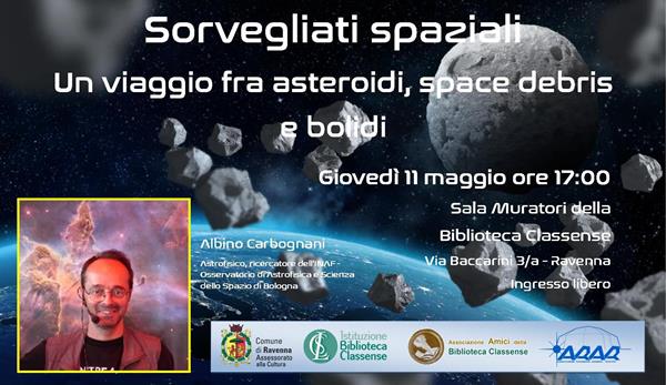 L'11 maggio il Dott. Albino Carbognani (astrofisico e ricercatore dell’INAF-Osservatorio di Astrofisica e Scienza dello Spazio di Bologna per un progetto sul monitoraggio dei detriti spaziali con telescopi ottici dal suolo) ci ha parlato di asteroidi, bolidi e detriti spaziali "Sorvegliati speciali".