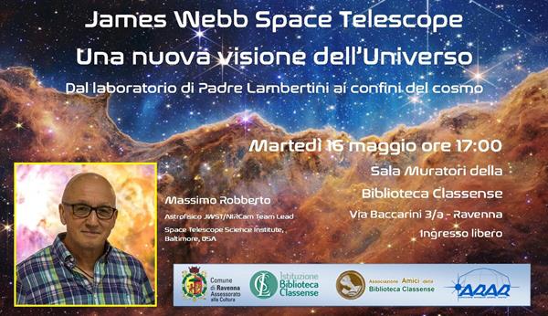 Il 16 maggio è stata la volta dell'Ing. Massimo Robberto (ricercatore presso la Johns Hopkins University, responsabile del team NIRCam, Near-Infrared Camera, lo strumento principale del Telescopio Spaziale James Webb - JWST, allo Space Telescope Science Institute, STScI, di Baltimora) che ci ha intrattenuto sulle ultime dal JWST e sulle nuove visioni dello spazio.