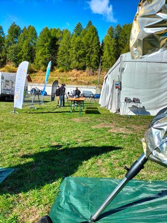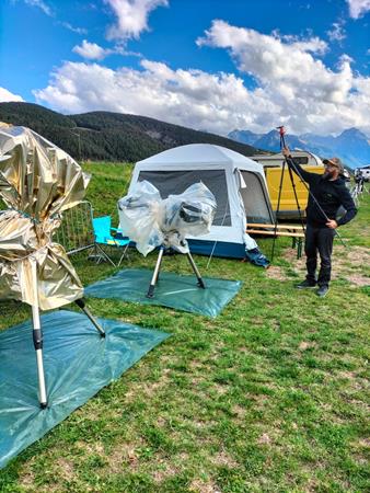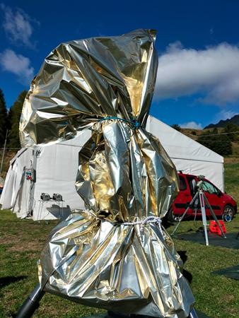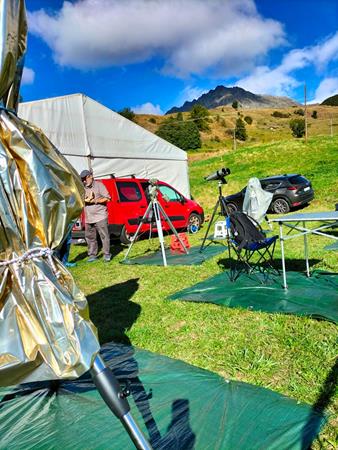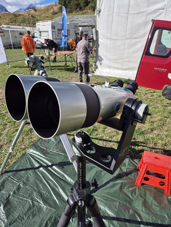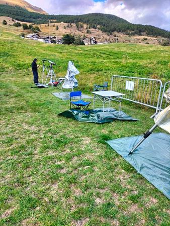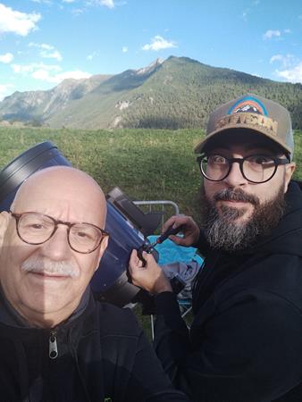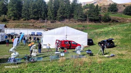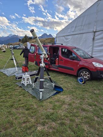 Quest'anno la solita piazza centrale non era dedicata allo Star Party e quindi ci siamo sistemati nell'area dell'ex campo sportivo, dove almeno 100 telescopi erano piazzati per osservare e fotografare il cielo. Il nostro amico Paolo Calcidese, direttore del Planetario e organizzatore dello Star Party, ci ha riservato un angolo appartato e protetto. Perfetto per noi e quindi abbiamo piazzato tutti i nostri strumenti.