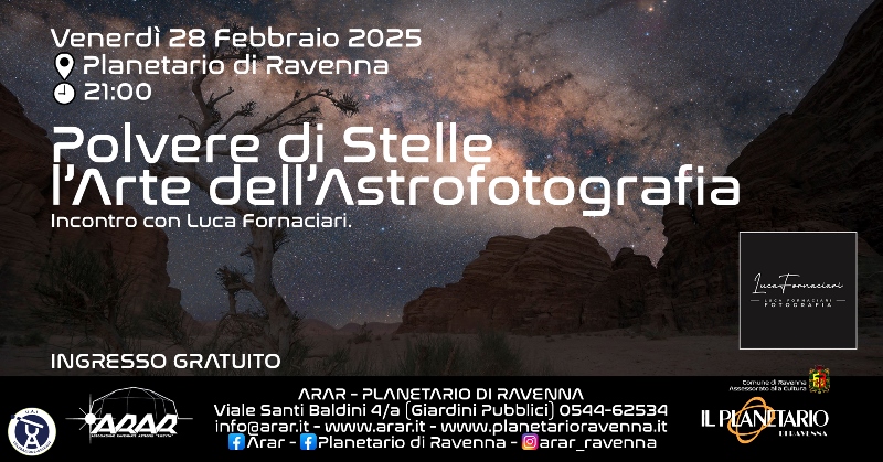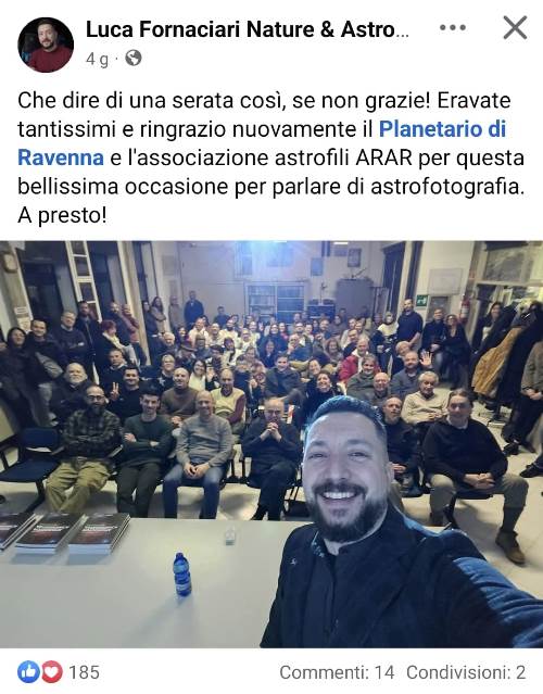 Dopo averlo incontrato alla Fiera di Cesena a Novembre, abbiamo concretizzato l'idea per un interessante conferenza con l’astrofotografo Luca Fornaciari. Venerdì 28 febbraio, alle ore 21:00 nella sala conferenze del Planetario è andata in scena "Polvere di Stelle - L’arte dell’astrofotografia"