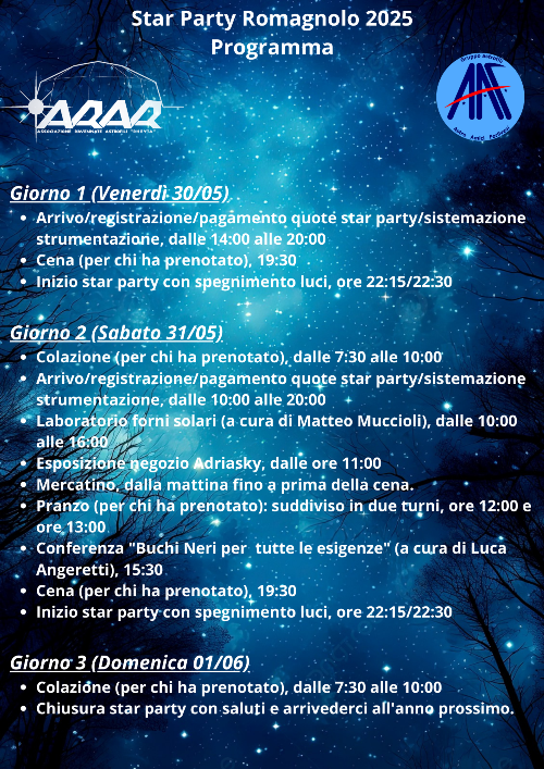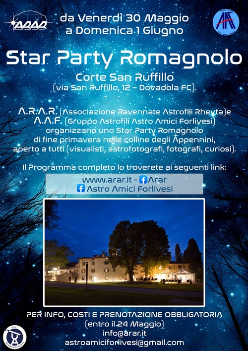 A.R.A.R. (Associazione Ravennate Astrofili Rheyta) e A.A.F. (Gruppo Astrofili Astro Amici Forlivesi) hanno organizzato uno Star Party Romagnolo di fine primavera nelle colline degli Appennini, aperto a tutti gli appassionati (visualisti, astrofotografi, fotografi, curiosi).